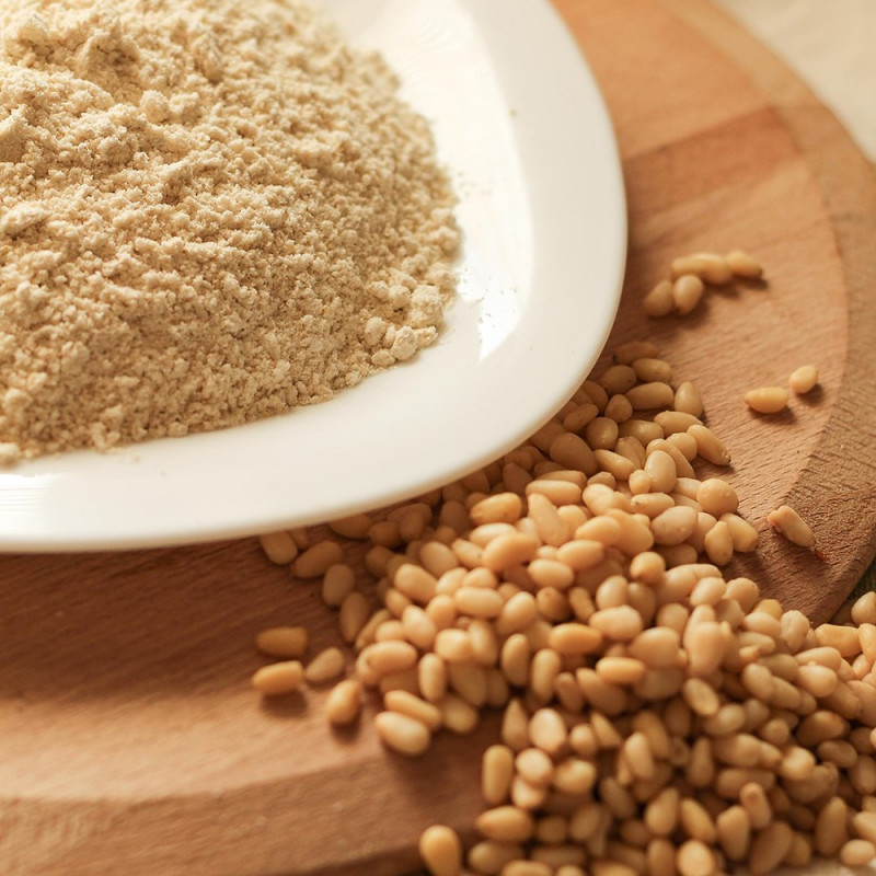 то продукт, получается из чистых ядер кедрового ореха в результате холодного прессования кедрового масла. Полученный после производства масла жмых обрабатывается по особой технологии, в результате чего появляется мука из кедрового ореха. Она содержит: минералы и витамины, а также масла кедрового ореха до 30%.